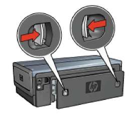 3. Сожмите два фиксаторных рычажка на задней дверце принтера по направлению друг к другу, затем снимите дверцу.