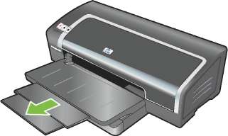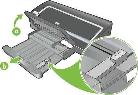 Когда в лоток подается бумага 215,9 x 279,4 мм, расширитель лотка будет находится вплотную к бумаге, но останется небольшой зазор между расширителем и лотком. Лоток расширяется для приема более крупного формата носителя.