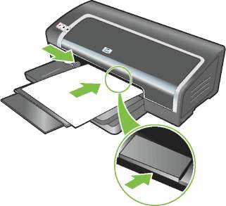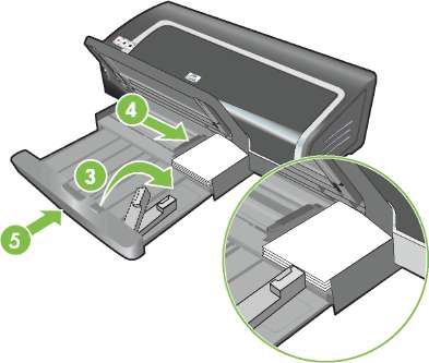 4. Вставьте до упора печатной стороной вниз до 150 листов бумаги или пачку носителя (который не превосходит по высоте направляющую бумаги) по правой стороне подающего лотка.