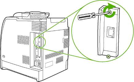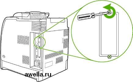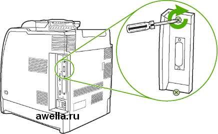 6. Вставьте и затяните контровочные винты, прилагаемые к плате сервера печати.