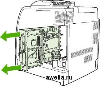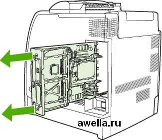 5. Осторожно потяните за черные выступы, чтобы извлечь плату форматтера из принтера. Положите плату форматтера на чистую ровную заземленную поверхность.