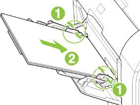 4. Полностью раздвиньте направляющие для бумаги (выноска 1) и загрузите носитель в лоток 1 (выноска 2). Отрегулируйте направляющие по размеру бумаги.