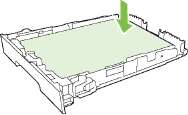 4. Надавите на стопку, чтобы убедиться, что она находится под ограничивающими фиксаторами для бумаги на боковой стороне лотка.