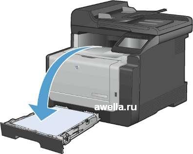 6. Не меняя ориентацию листов, извлеките стопку бумаги из выходного приемника и вставьте ее в подающий Лоток 1 лицевой стороной вниз.