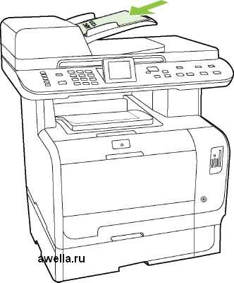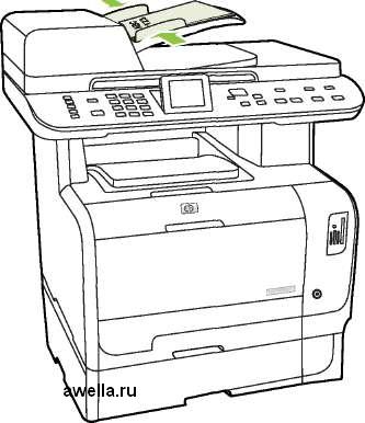1. Поместите стопку оригиналов во входной лоток устройства автоматической подачи документов (АПД) верхним краем к устройству. Лицевая сторона стопки должна быть направлена вверх, при этом первая страница для копирования должна находиться наверху стопки.