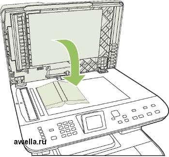 Поднимите крышку планшета сканера и поместите оригинал на планшет сканера лицевой стороной вниз, придвинув левый верхний угол документа к правому нижнему углу стекла. Аккуратно закройте крышку.