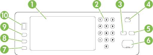 В состав панели управления входит сенсорный графический дисплей, клавиши управления заданиями, цифровая клавиатура и три световых индикатора состояния.