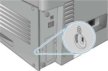 Отсек форматтера на задней части устройства имеет разъем для присоединения кабеля безопасности. Блокировка отсека форматтера предотвращает извлечение из него ценных компонентов.