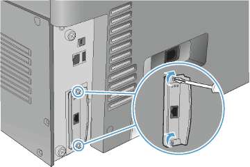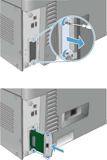 4. Плотно вставьте плату сервера печати HP Jetdirect (или другой модуль) в разъем.