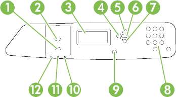 Панель управления оснащена текстовым дисплеем. С его помощью можно управлять всеми функциями устройства. Клавиши и цифровая клавиатура используются для управления заданиями и отслеживания состояния устройства. Индикаторы указывают общее состояние устройства в них.