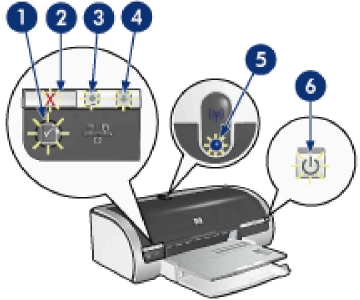 1. индикатор клавиши 'Сеть' 2. клавиша 'Отмена' 3. индикатор состояния 4. индикатор возобновления печати 5. индикатор обмена данными по беспроводному каналу 6. индикатор питания