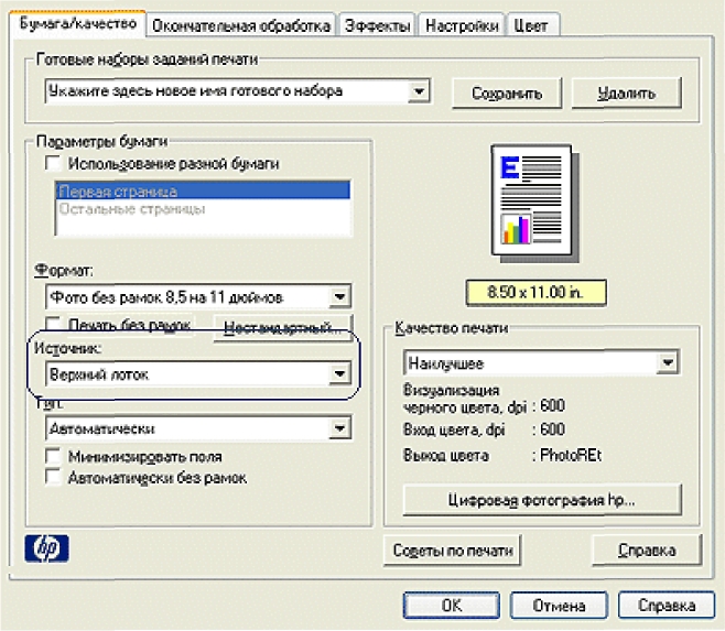 Для выбора источника бумаги следуйте следующим инструкциям: