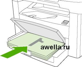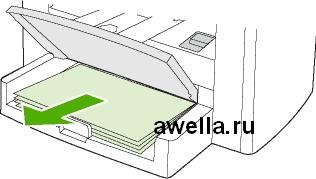 В приоритетный входной лоток модели можно загрузить не более 10 листов плотностью 80 г/м2 или один конверт, прозрачную пленку или карточку. Загружайте носитель коротким краем вперед и стороной для печати вверх. Чтобы предотвратить замятия и перекосы, всегда регулируйте направляющие перед подачей носителя.
