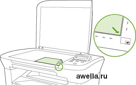 2. Поместите оригинал на планшет сканера сканируемой стороной вниз, придвинув левый верхний угол документа к правому нижнему углу стекла.