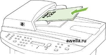 1. Поместите стопку оригиналов во входной лоток устройства автоматической подачи документов (АПД) верхним краем к устройству. Лицевая сторона стопки должна быть направлена вверх, при этом первая страница для копирования должна находиться наверху стопки.