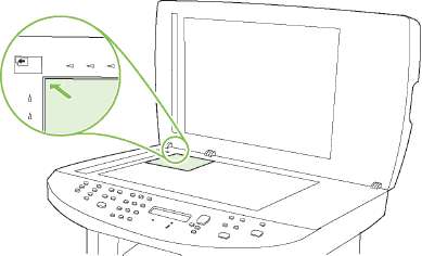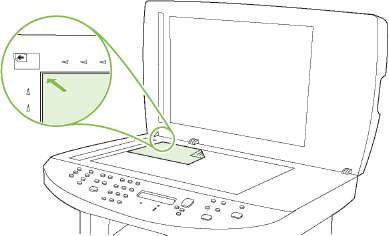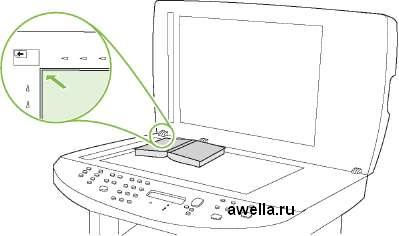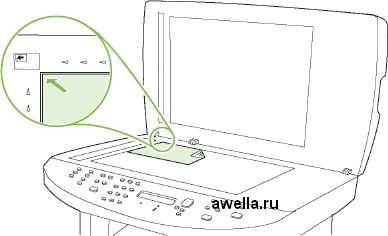 3. Поместите исходный документ на планшет сканера лицевой стороной вверх, верхний левый угол документа должен находиться в углу планшета, который отмечен значком.