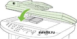1. Поднимите крышку и положите на планшетный сканер книгу, открытую на странице, которую необходимо скопировать, таким образом, чтобы она была расположена в углу, обозначенном значком на сканере.