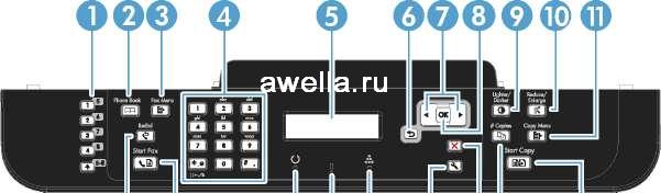 Буквенно-цифровая клавиатура. Бувенно-цифровые кнопки используются для ввода данных в панель управления устройства и набора телефонных номеров для факса.