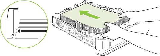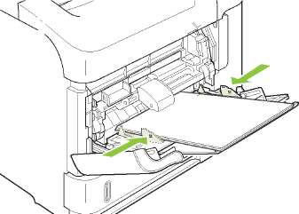 5. Убедитесь, что высота пачки не превышает указателей максимальной высоты на направляющих, а передний край пачки выровнен по стрелкам.