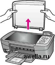 Если выполняется копирование или сканирование оригинала, размеры которого больше обычного, можно полностью снять крышку с аппарата. Для снятия крышки поднимите ее и установите в открытом положении, а затем возьмите крышку с боков и потяните вверх. Аппарат нормально работает со снятой крышкой. Установите крышку на место, вставив шарниры обратно в соответствующие гнезда.