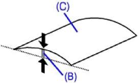 В зависимости от типа носителя бумага может пачкаться или неправильно под даже если она не скручивается внутрь. В таком случае перед печатью следуйт приведенным ниже инструкциям, чтобы скрутить углы бумаги наружу на 0,1 дю мм (B) в высоту. Это может улучшить результаты печати.