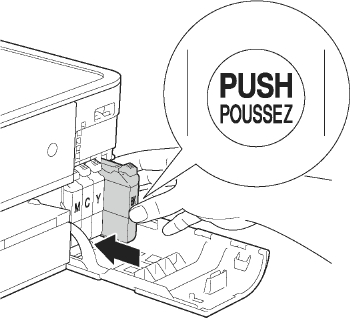 Осторожно нажимайте на заднюю стенку картриджа с отметкой "PUSH" (Нажать), пока не поднимется фиксатор картриджа, а затем закройте крышку отсека с картриджами.