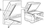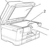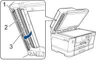 4. (MFC-J3930DW) Откройте крышку сканера (1), очистите белую планку (2) и стеклянную планку (3) мягкой безворсовой тканью, смоченной в воде.