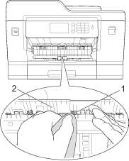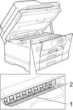 6. Поднимите крышку для устранения замятия бумаги (2), а затем очистите заднюю поверхность роликов подачи бумаги (1) мягкой безворсовой тканью, смоченной водой. Закончив очистку, протрите ролики сухой, мягкой неворсистой тканью, чтобы полностью удалить влагу.