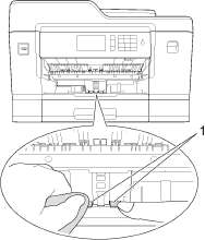 2. Очистите бумагоопорную пластину устройства (1) и область вокруг нее, удалив капли чернил сухой, мягкой неворсистой тканью.