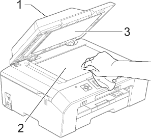 Поднимите крышку для документа (1). Мягкой неворсистой тканью, смоченной негорючим очистителем для стекол, протрите стекло сканера (2) и белый пластик (3).
