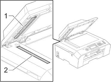 Мягкой неворсистой тканью, смоченной негорючим очистителем для стекол, очистите белую планку (1) и стеклянную планку (2) в блоке автоподатчика.
