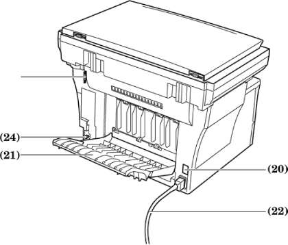 (24) Защелка правой крышки (Эта защелка извлекается для того, чтобы открыть правую крышку аппарата при установке дополнительной памяти.