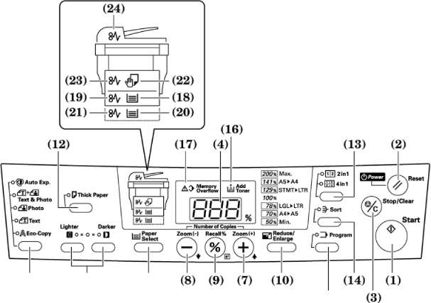 (4) Дисплей количества копий / масштаба (Отображает количество копий, которое должен сделать аппарат, либо выбранный масштаб копирования. Горящий символ обозначает, что на дисплее отображается значение выбранного масштаба.)