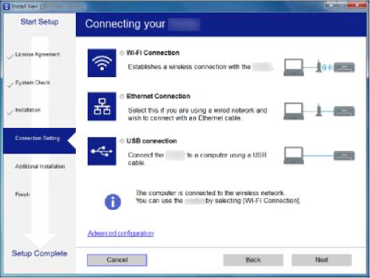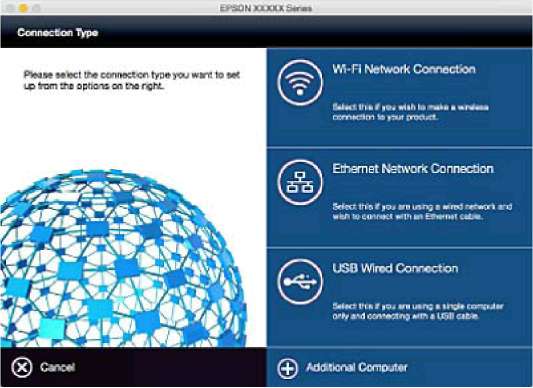 Следуйте инструкциям на экране, пока не появится следующий экран. Выберите способ подключения принтера к компьютеру.