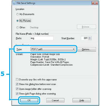 Для параметра Type (Тип) выберите PDF, а затем нажмите OK. Отсканированное изображение сохранено.