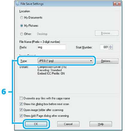 Для параметра Type (Тип) выберите JPEG, а затем нажмите OK. Отсканированное изображение сохранено.