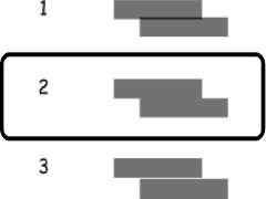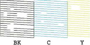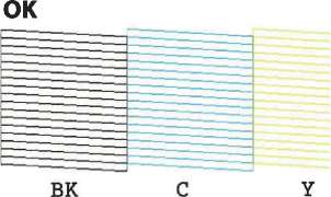 5. Просмотрите распечатанный шаблон. Если на отпечатке видны разорванные линии или отсутствуют некоторые сегменты, как показано на шаблоне NG, то дюзы печатающей головки могут быть забиты. Перейдите к следующему шагу.Если на отпечатке нет разорванных линий и отсутствующих сегментов, как показано на шаблоне ОК, то дюзы печатающей головки не забиты. Не требуется производить очистку печатающей головки. Выберите ОК с помощью кнопки А.