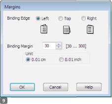 Для параметра Unit (Шаг) выберите cm (см) или inch (дюймы). Затем укажите ширину переплета. Введите значение ширины переплета в диапазоне от 0,3 до 3,0 см (от 0,12 до 1,18 дюймов).