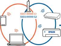В большинстве беспроводных маршрутизаторов имеется функция разделения, которая блокирует связь между устройствами в пределах одной сети (SSID). Если вы не можете установить связь между принтером и компьютером или интеллектуальным устройством, даже если они подключены к одной сети, отключите функцию разделения устройств на беспроводном маршрутизаторе. За более подробной информацией обратитесь к руководству по беспроводному маршрутизатору.