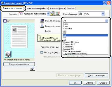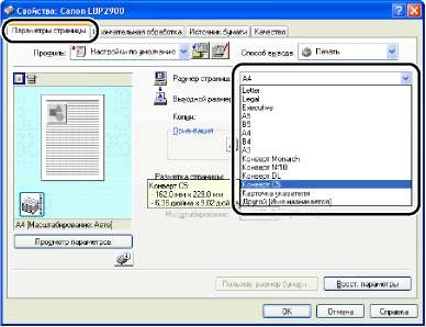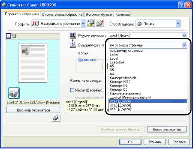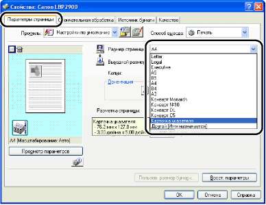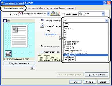 Откройте вкладку [Параметры страницы], затем в списке [Размер страницы] выберите размер документа, который Вы создали в приложении.