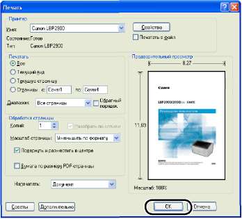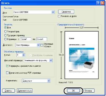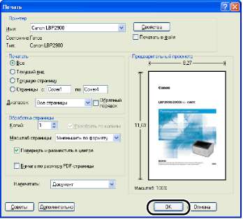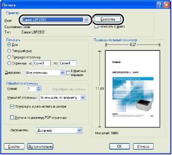Выберите [Print] (Печать) в меню [File] (Файл) в приложении. В поле [Имя] или [Имя принтера] выберите Ваш принтер и нажмите кнопку [Свойства].