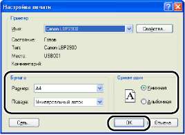 Укажите размер бумаги документа и ориентацию печати, затем нажмите кнопку [OK].