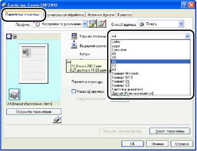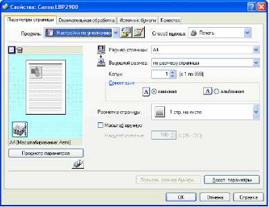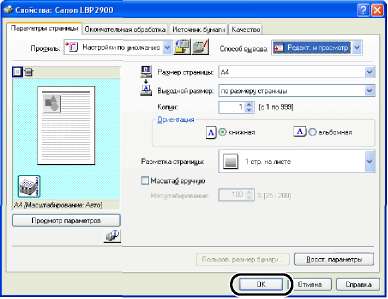 Настройте параметры печати на вкладках [Параметры страницы], [Окончательная обработка], [Источник бумаги] и [Качество].