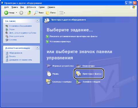 Для Windows XP Home Edition: В меню [Пуск] выберите [Панель управления], затем щелкните [Принтеры и другое оборудование] -> [Принтеры и факсы].