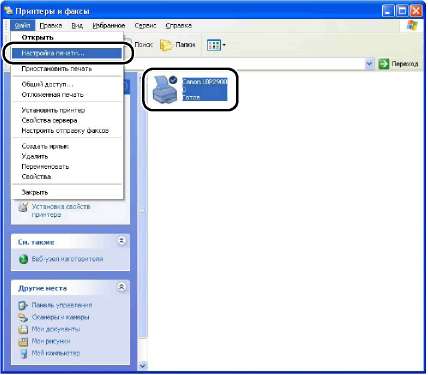Выберите значок, соответствующий Вашему принтеру, а затем в меню [Файл] выберите пункт [Настройка печати].