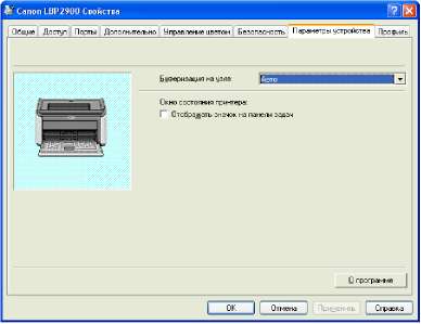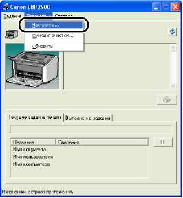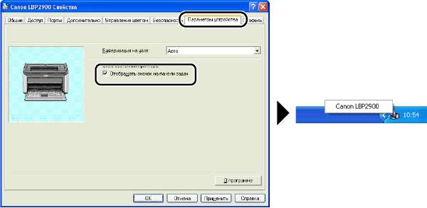 Установите флажок [Отображать значок на панели задач] на вкладке [Конфигурация]/[Параметры устройства] в диалоговом окне [Свойства принтера]. Значок окна состояния принтера появится на панели задач Windows, и, щелкнув этот значок, а затем щелкнув [Canon LBP2900], Вы можете открыть окно.