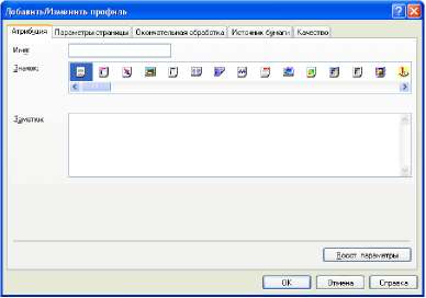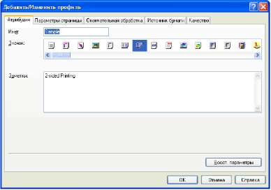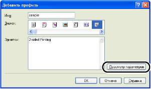 Профиль позволяет сохранить или импортировать сразу все настройки печати, заданные на вкладках [Параметры страницы], [Окончательная обработка], [Источник бумаги] и [Качество]. Можно также добавлять, изменять и выбирать профили.