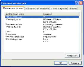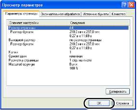 Выбирая вкладки [Параметры страницы], [Окончательная обработка], [Источник бумаги], [Качество] или [Конфигурация]/[Параметры устройства], можно просмотреть список параметров печати для каждой вкладки.