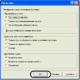 Окно состояния принтера открывается автоматически во время печати и при возникновении ошибок. Если при помощи ипункта [Настройка] меню [Параметры] окна состояния принтера для параметра [Отображать окно состояния принтера] не установлено значение [При запуске печати], то окно состояния принтера не будет отображаться в процессе печати.