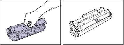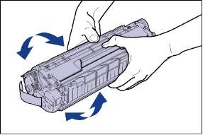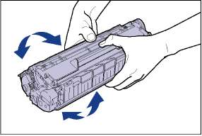 Возьмите его, как показано на рисунке, осторожно наклоните его 5 или 6 раз из стороны в сторону, а затем вперед и назад для того, чтобы тонер распределился равномерно внутри.